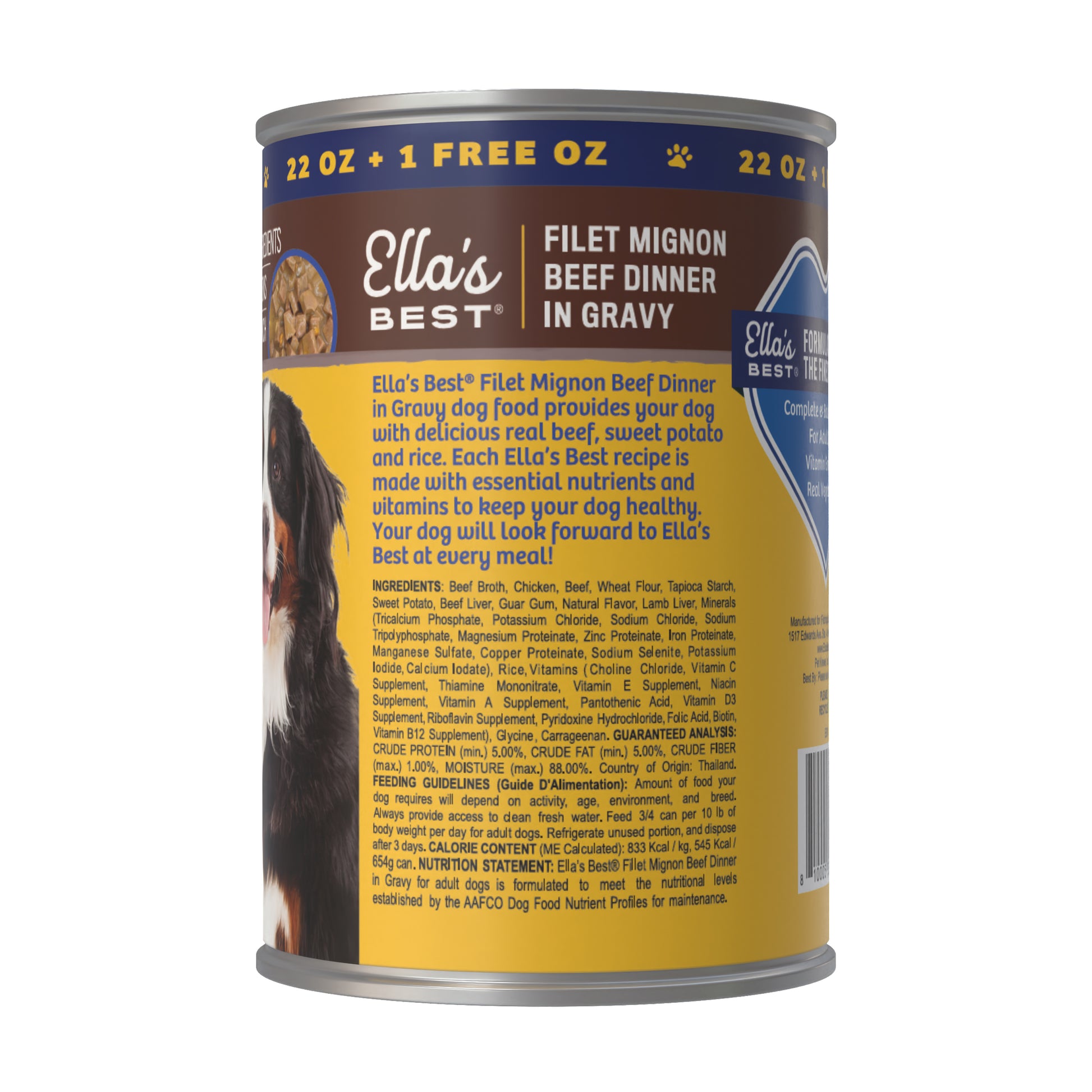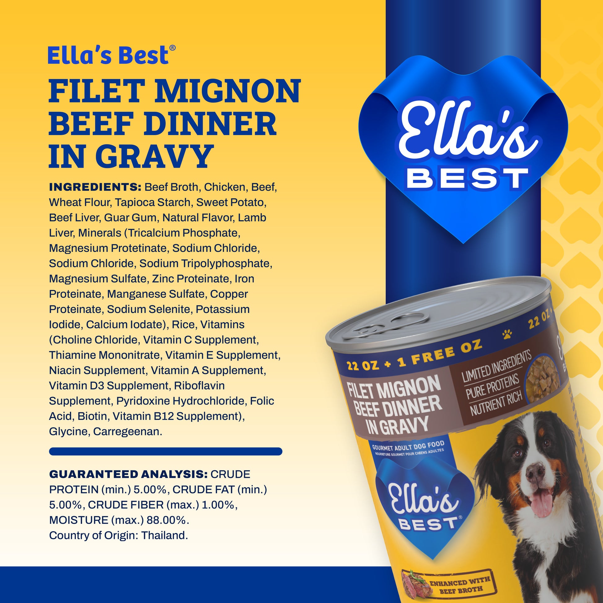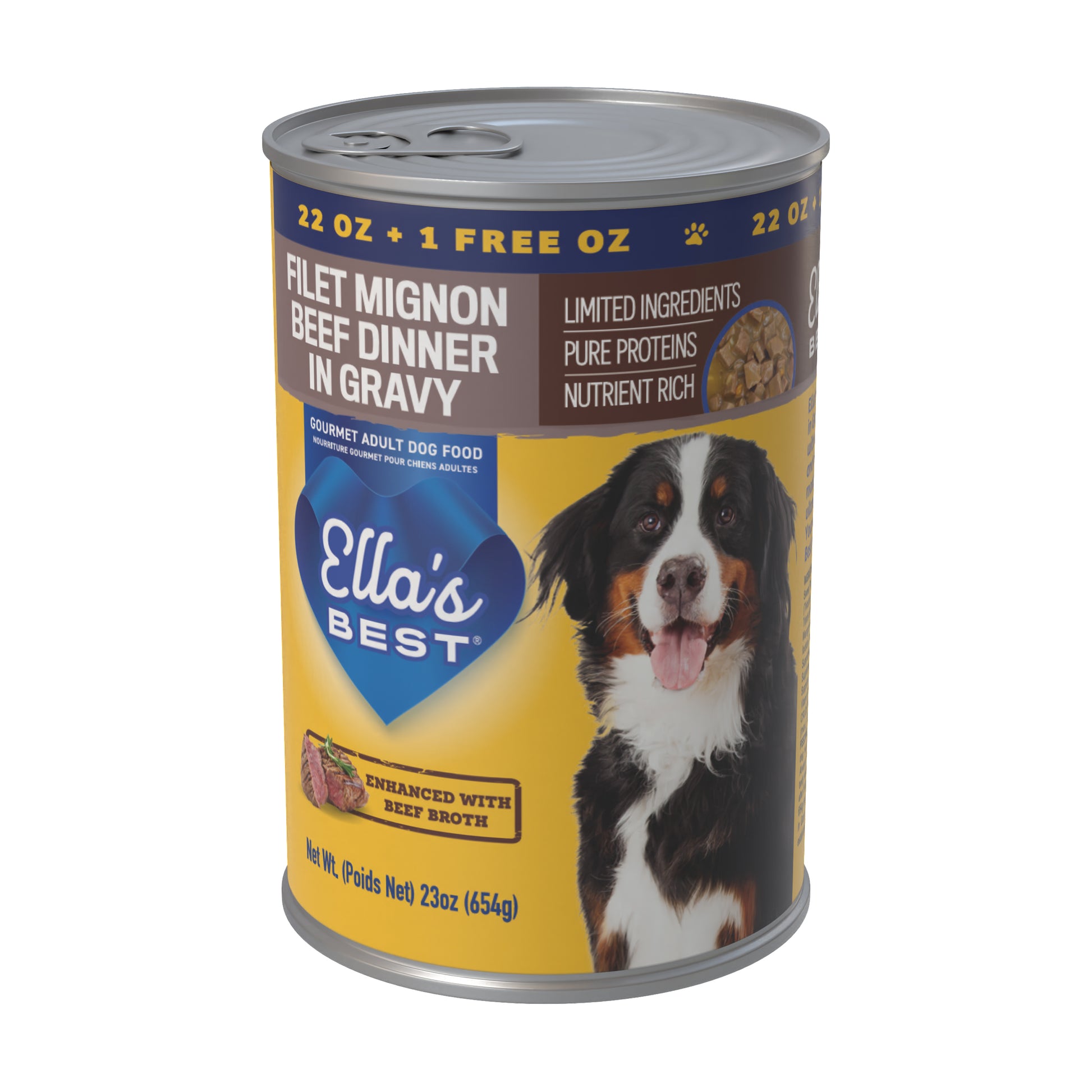 Treat your dog to the savory taste of steakhouse-inspired nutrition with Ella’s Best® Filet Mignon Beef Dinner in Gravy. Crafted with real beef, beef liver, and chicken simmered in flavorful beef broth, this gourmet wet dog food delivers rich protein and mouthwatering taste in every bite. Thoughtfully made with wholesome ingredients like sweet potato and rice, it supports gentle digestion and long-lasting energy. Fortified with vitamins and minerals, it’s designed to promote strong muscles, a shiny coat, and overall health. With limited ingredients and no artificial colors or fillers, it’s the ideal choice for pet parents who want real, honest food for their adult dogs.