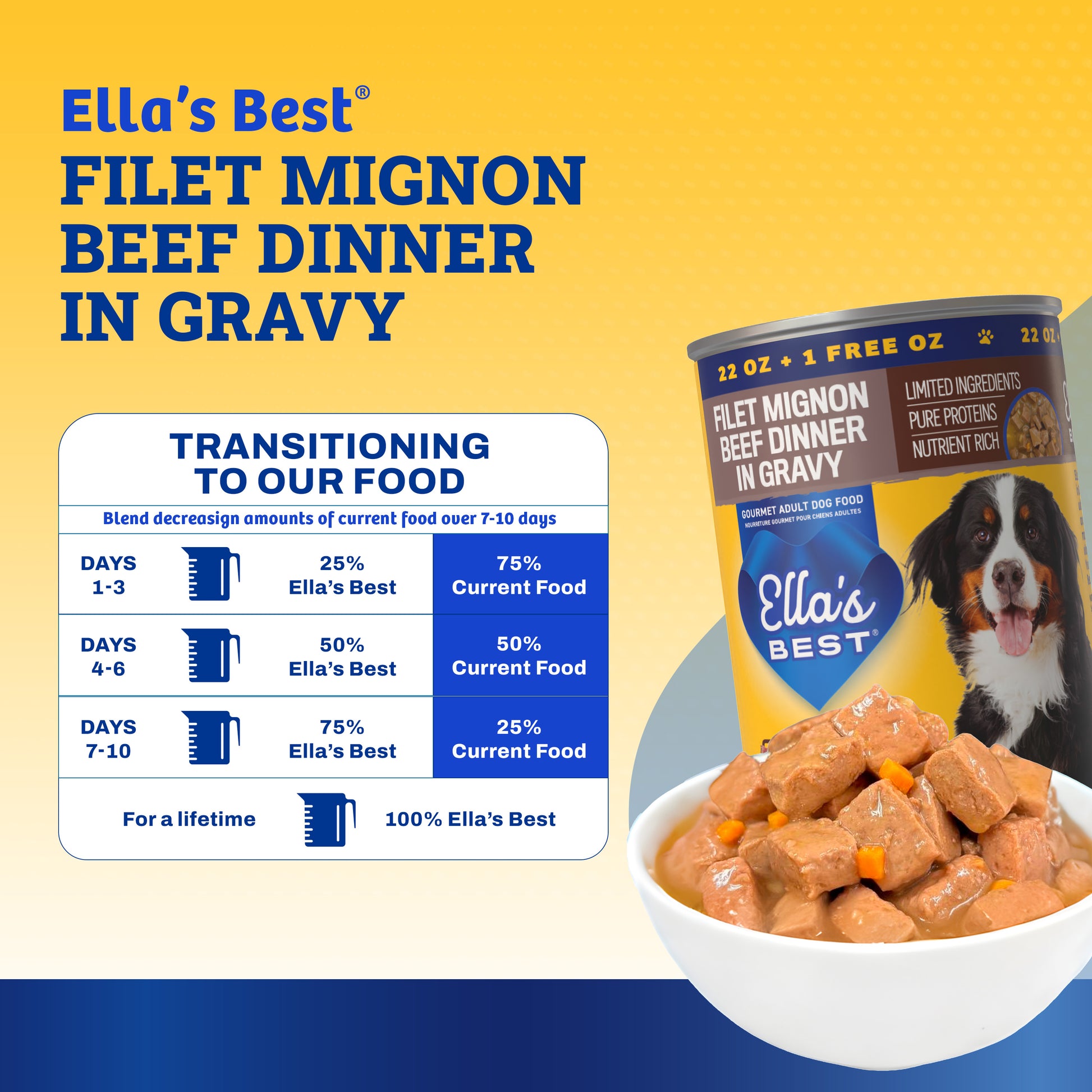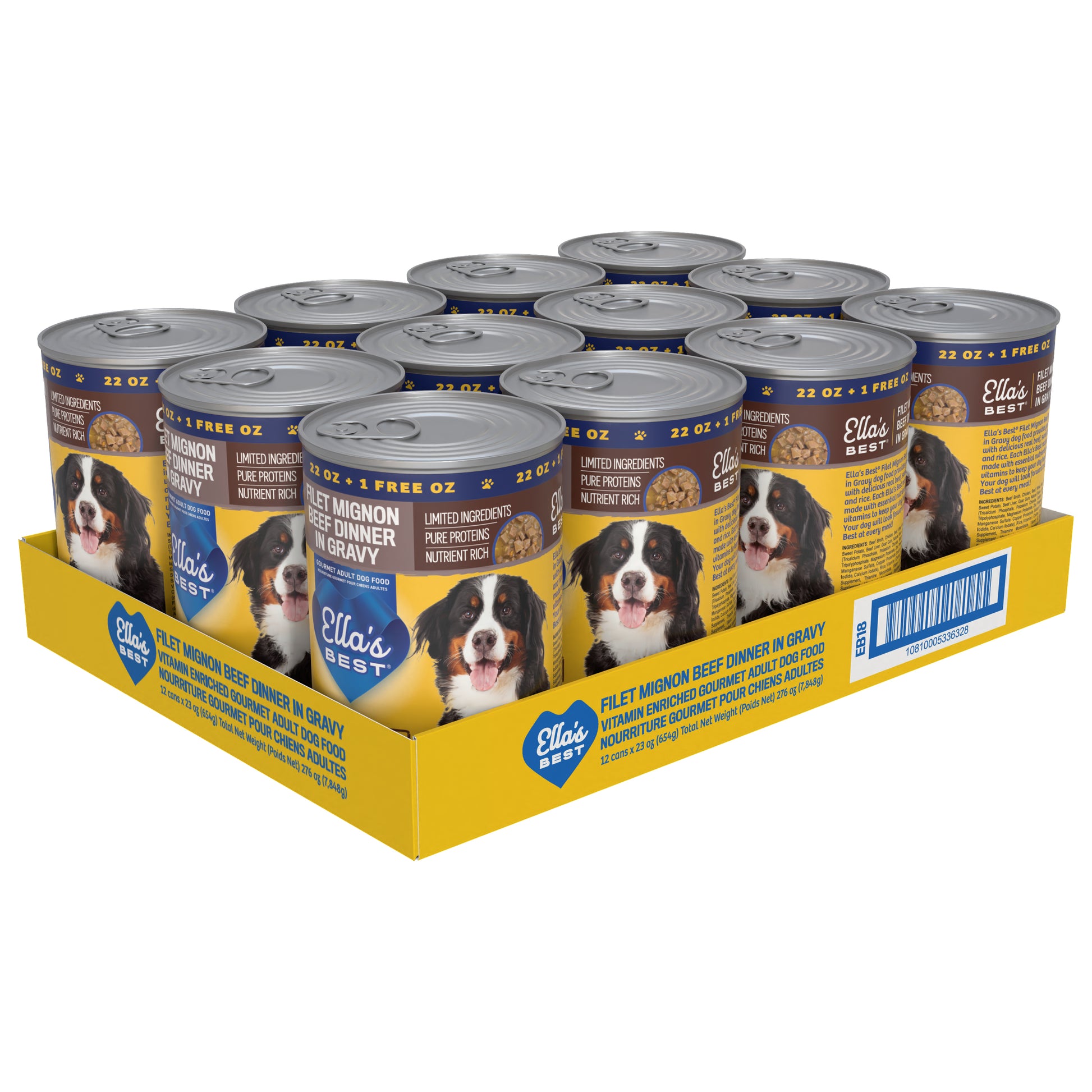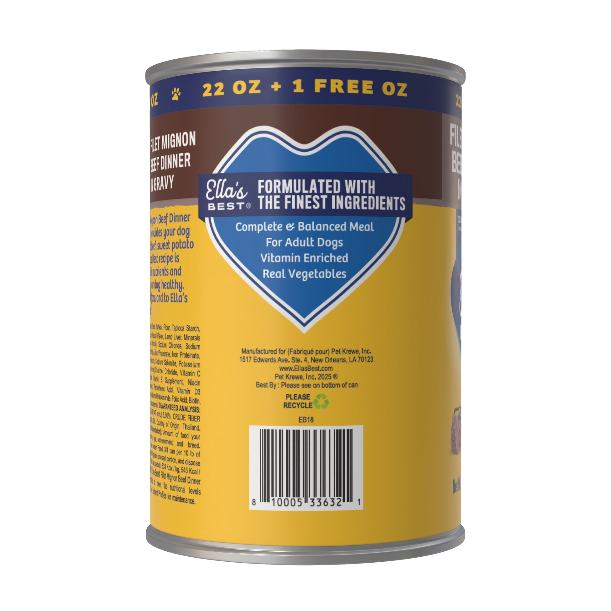 Treat your dog to the savory taste of steakhouse-inspired nutrition with Ella’s Best® Filet Mignon Beef Dinner in Gravy. Crafted with real beef, beef liver, and chicken simmered in flavorful beef broth, this gourmet wet dog food delivers rich protein and mouthwatering taste in every bite. Thoughtfully made with wholesome ingredients like sweet potato and rice, it supports gentle digestion and long-lasting energy. Fortified with vitamins and minerals, it’s designed to promote strong muscles, a shiny coat, and overall health. With limited ingredients and no artificial colors or fillers, it’s the ideal choice for pet parents who want real, honest food for their adult dogs.
