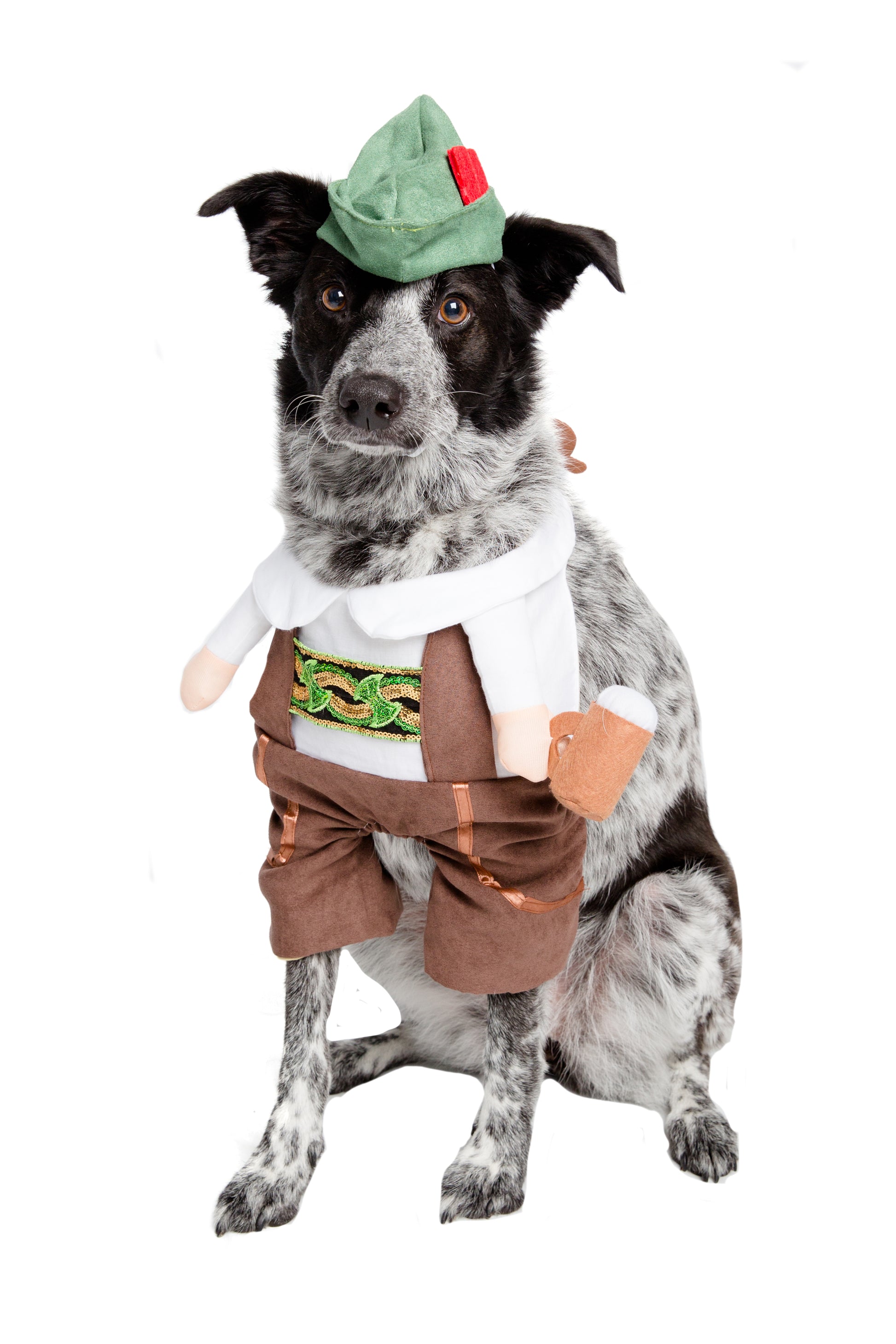 Grab a pint with your best friend in this German Beer Dog/Cat Costume to celebrate Oktoberfest! Pairs well with an afternoon drink on your favorite patio, pretzels, and chew toys. The “walking” dog/cat costume attaches around your dog’s neck to make it look like they have human arms for carrying their favorite brew. To dress your pet in the Oktoberfest dog costume, put their front legs through the leg holes and secure the hook and loop closure around their neck. The hat has a 10” adjustable elastic strap.