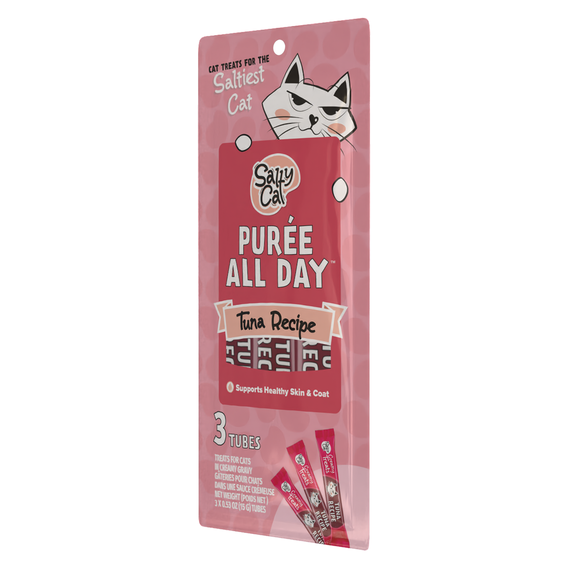 At Salty Cat, we’re all about clean, craveable nutrition. Our Purée All Day Creamy Tuna Tube Treats bring together real seafood flavor, soft texture, and simple ingredients, so every lick is a moment of joy your cat will look forward to.