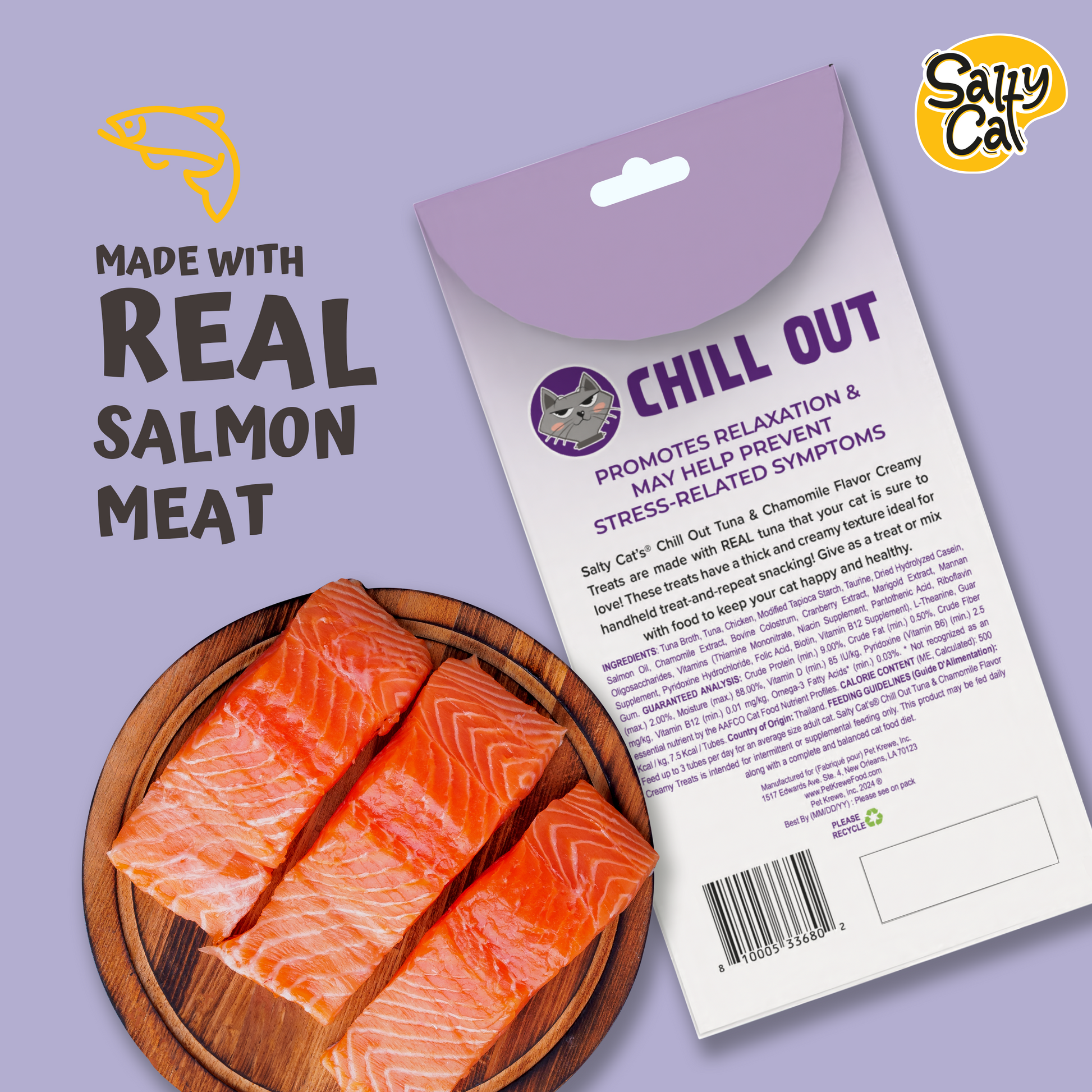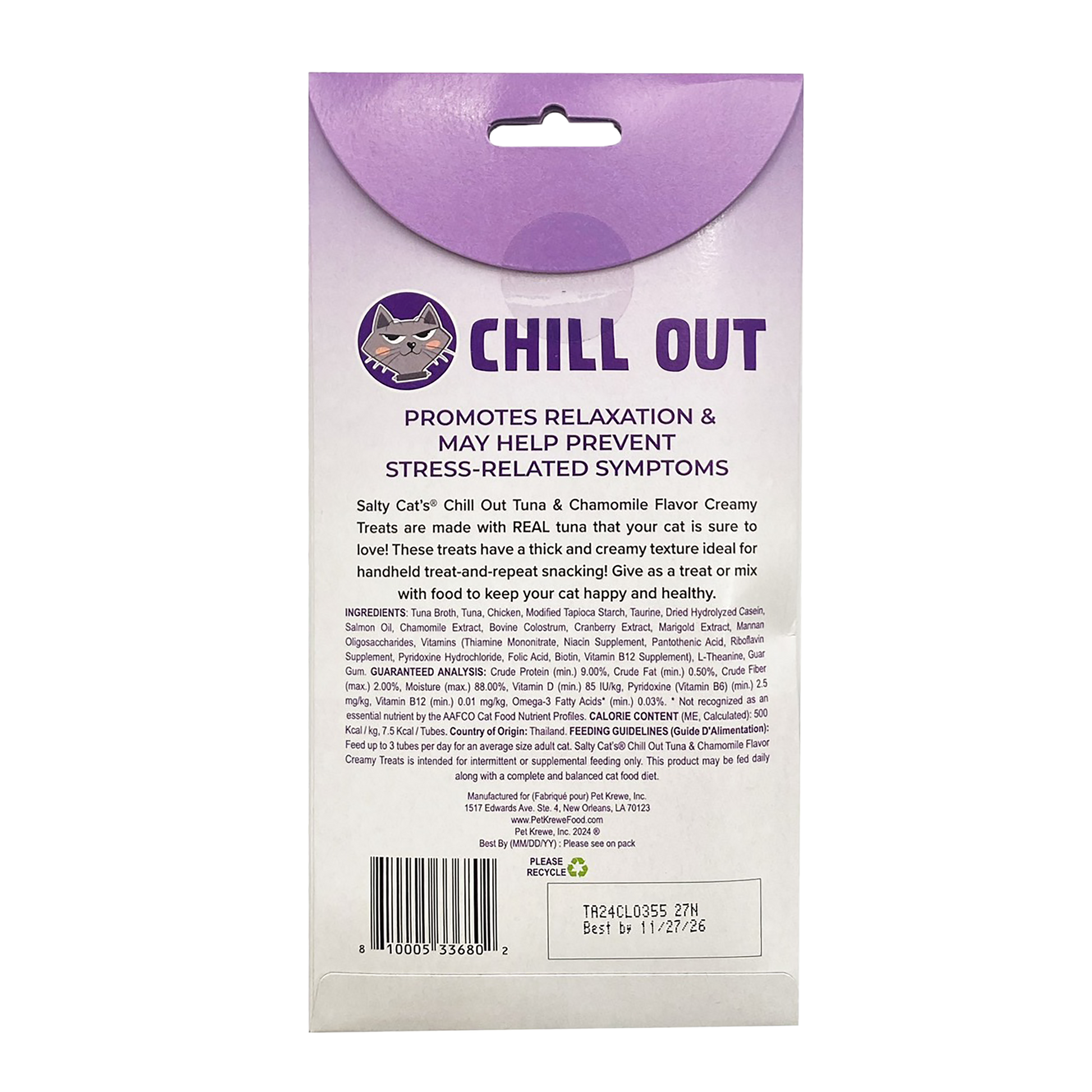Feed up to 3 tubes per day for an average size adult cat. Salty Cat’s Chill Out Tuna & Chamomile Flavor Creamy Treats is intended for intermittent or supplemental feeding only. This product may be fed daily along with a complete and balanced cat food diet.