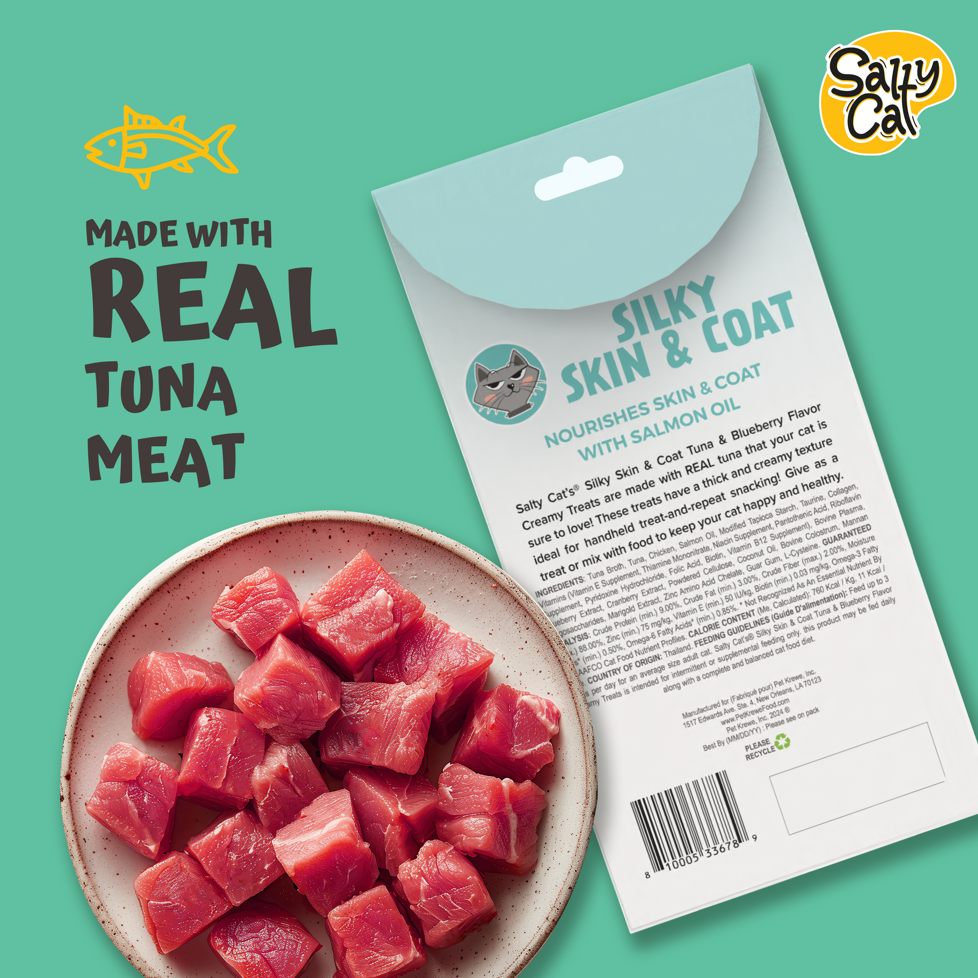Feed up to 3 tubes per day for an average size adult cat. Salty Cat’s Silky Skin & Coat Tuna & Blueberry Flavor Creamy Treats is intended for intermittent or supplemental feeding only. this product may be fed daily along with a complete and balanced cat food diet.